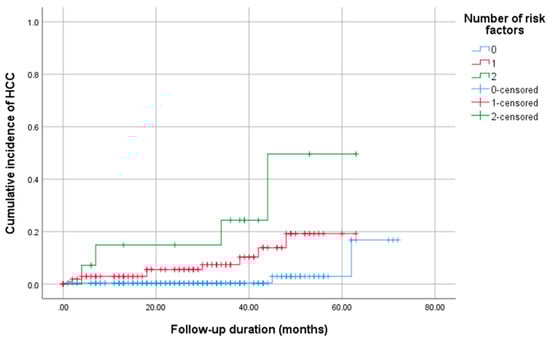 Cumulative incidence of hepatocellular carcinoma according to the number of baseline risk factors identified in the multivariable analysis (FIB-4 > 3.25 at SVR and MELD ≥ 10). Patients were stratified into three groups based on the number of risk factors: 0, 1, or 2.