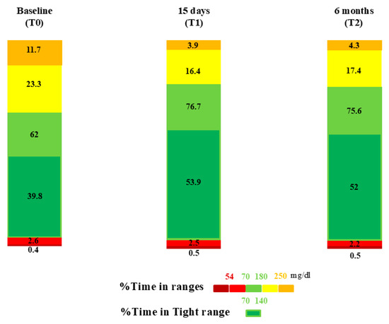 As shown in Table 1, all CGM metrics improved significantly at T2 compared to baseline. At six months, TIR was 75.8 ± 9.0%, TAR was 21.6 ± 9.6% (TAR1 17.4 ± 7.5%, TAR2 4.3 ± 3.9%) and TBR was 2.6 ± 2.5% (TBR1 2.2 ± 1.9, TBR2 0.5 ± 0.8%) (Figure 1). GMI was 6.8 ± 0.4%, mean glucose was 144.6 ± 14.8 mg/dL, and CV was 34.2 ± 6.1%. TITR reached 52.1 ± 10.5% and GRI was 27.4 ± 10.3. AID systems were used in automatic mode for 95% ± 6.2% of the time.