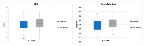 Total daily insulin dose increased significantly across the study period (0.75 ± 0.29 IU/kg at T0 vs. 0.85 ± 0.23 IU/kg at T2; p < 0.001). Similarly, BMI z-score also increased from 0.5 ± 1.2 SD at the baseline to 0.7 ± 1.2 SD at six months of follow-up (p = 0.008) (Figure 2).