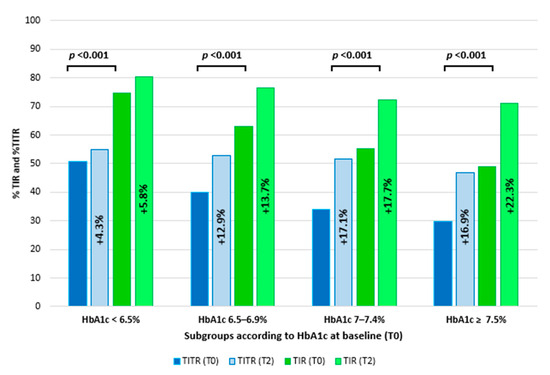 Graphical representation of time in range (TIR) and time in tight range (TITR) variations from T0 to T2 in different subgroups based on the baseline HbA1c levels. Both TIR and TITR significantly improved in all subgroups.
