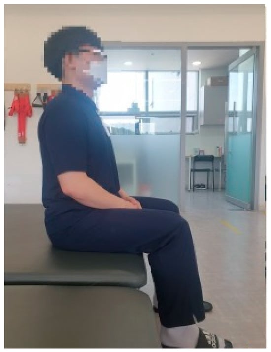 All movements for the experiment were initiated from an upright sitting position, using a chair without a backrest or armrests. In this study, the upright sitting position is defined as sitting with the hips and half of the thighs in contact with the seat, feet flat on the ground, and the back straight. Additionally, with the gaze directed straight ahead, the feet are positioned shoulder-width apart, with the hip and knee joints flexed at 90-degree angles, and the ankle joints in a neutral position (Figure 1). The movements were initiated in response to the therapist’s instructions, and participants were given 2 s to move from the starting position to the end range. Participants were required to hold the position at the end range for 5 s, with no time limit for returning to the starting position. A metronome was used to ensure precise timing. If either the buttocks or feet lifted at the end range, it was considered a failure, and an opportunity for reattempt was given. If the participant experienced three failures, the attempt was recorded as a failure. To prevent muscle fatigue between movements, a 1-min rest period was provided between each movement.