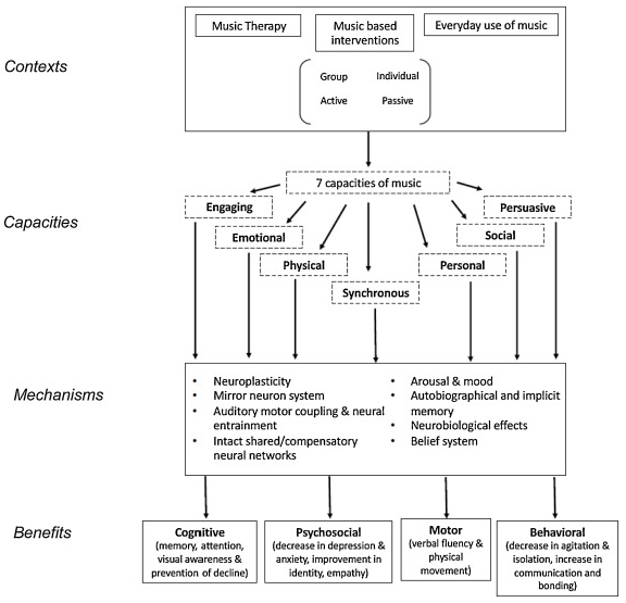Figure 1. The Therapeutic Music Capacities Model (TMCM) [15]. This framework illustrated neurological and psychological mechanisms that link the capacities impacted by MT to cognitive, psychosocial, motor, and behavioural benefits.