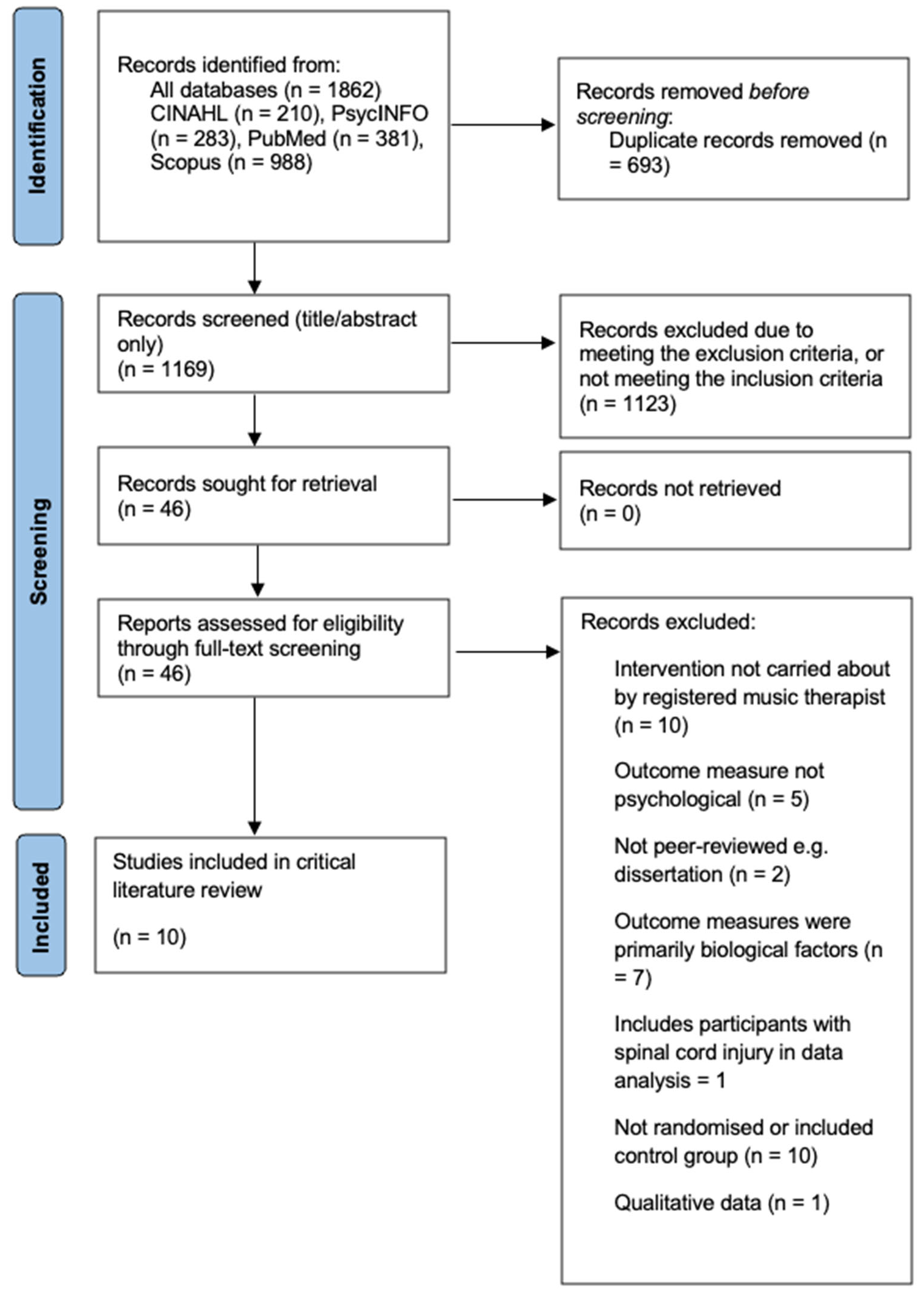 Five specific inclusion and exclusion criteria were used to determine eligible studies for inclusion in the review (Table 2). All neurological conditions were included in the search, except for dementia, spinal cord injuries, and neurodevelopmental conditions. Search results were filtered between 1 January 2015 and 31 January 2025 to obtain the most recent research in the field worldwide. This captures a time when MT is a registered profession requiring formal training, and before, during and after the COVID-19 pandemic when alternative forms of delivering MT were required, such as distance, instrument-use limitations, and online delivery, which remain incorporated clinically and therefore relevant to current practice [7,32,61,62,63]. Limiting the search to English language benefits time constraints, reduces heterogeneity, and is the common language used in MT reviews, although may bias the range of studies despite opening the search to any location [64,65,66]. RCT-only studies were included since RCTs are recommended to improve the quality of findings establishing the effects of MT for neurological conditions [35,36,43]. In the current review, RCT pilot studies were included with data relevant to MT effectiveness [67]. Furthermore, RCT pilot studies are increasingly comparable to main studies [68]. Five of the ten papers [11,33,53,54,55] included outcome measures not directly relevant to the research question but were included to ensure relevant data were captured and because different outcomes can be related since MT may be integrated into a multi-disciplinary approach [42]. However, the combined outcomes in these studies were accounted for. MT for dementia, including Alzheimer’s disease, dementia with Lewy body, vascular dementia, mixed dementia, etc., and neurodevelopmental conditions [i.e., autism spectrum disorder, attention-deficit/hyperactivity disorder (ADHD), intellectual disability, specific learning and tic disorders] are better established and follow differing treatment pathways to other neurological conditions, and were therefore excluded [29,31,69]. Spinal cord injuries have been excluded to focus on neurological conditions where there are direct deficits on psychological factors such as cognition [70]. Since RCTs require quantitative data for increased comparability and generalisability, qualitative studies were excluded [71]. Reviews were excluded due to the research not being original, and protocols were excluded due to lack of data. Feasibility studies have been excluded with aims observing intervention feasibility rather than effectiveness. Studies researching non-psychological outcomes such as motor or physical were also excluded.