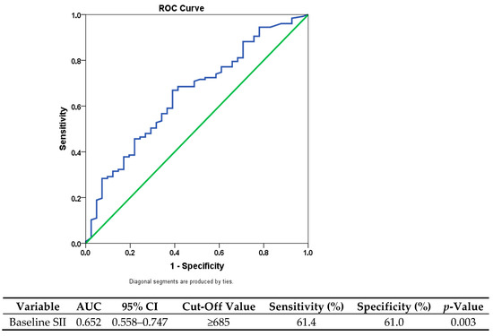 The discriminatory ability of baseline SII in predicting overall mortality was evaluated using receiver operating characteristic (ROC) curve analysis. According to the analysis, SII demonstrated a moderate discriminatory ability, with an area under the curve (AUC) of 0.652 (95% CI: 0.558–0.747; p = 0.003), indicating limited but statistically significant prognostic value.