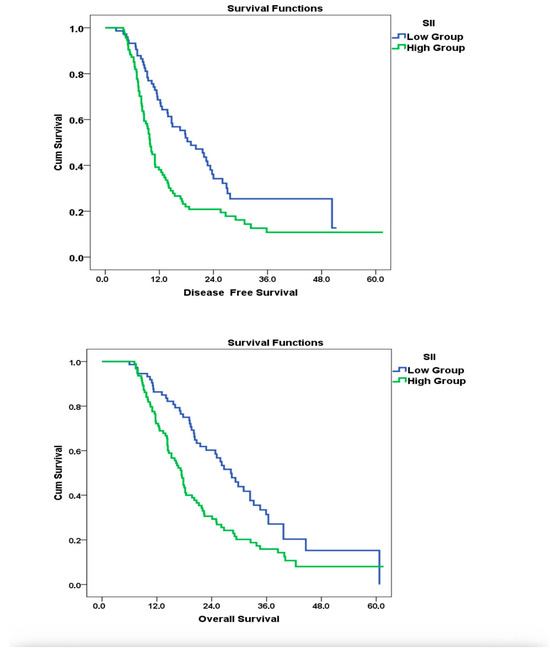 Consistently, in the multivariate Cox regression analysis, high SII values were independently associated with increased mortality risk (1.88, 95% CI: 1.36–2.89, p = 0.039), supporting the prognostic relevance of systemic inflammation. The adverse impact of elevated SII on DFS was also evident, with significantly shorter median DFS observed in the high SII group (9.9 vs. 19.0 months; p = 0.001). Kaplan–Meier survival curves and corresponding Cox regression models illustrating these findings are presented in Figure 2. However, consistent with our predefined analysis plan, DFS outcomes were displayed graphically (Figure 2) but not included in the main regression tables due to limited follow-up.
