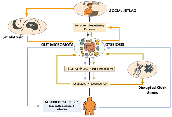 Schematic representation of the pathophysiological cascade linking social jetlag to metabolic dysfunction via the gut microbiota. Social jetlag, characterized by disrupted sleep and eating patterns, induces circadian misalignment that impairs gut microbial rhythmicity and composition. This dysbiosis is marked by decreased production of SCFAs, increased intestinal permeability, and elevated LPS translocation, collectively promoting systemic inflammation. The resulting immune activation contributes to insulin resistance and obesity. Additionally, suppression of melatonin and altered clock gene expression further exacerbate circadian and metabolic disturbances. Three interconnected feedback loops shape this pathophysiological network, each represented by color-coded arrows in the diagram. The orange loop highlights the central circadian pathway, in which social jetlag reduces melatonin secretion and disrupts the function of the suprachiasmatic nucleus (SCN), initiating microbial dysbiosis and subsequent metabolic impairment. The light blue loop traces the inflammatory–metabolic axis, where dysbiosis leads to systemic inflammation and metabolic dysfunction—processes that in turn can impair host circadian control and reinforce microbial instability. The golden-brown loop captures the reciprocal interaction between gut microbiota and peripheral circadian clock gene expression: microbial imbalance disrupts clock gene rhythmicity in peripheral tissues, which feeds back to destabilize microbial oscillations and inflammatory responses. This model emphasizes the bidirectional crosstalk among the gut microbiota, host circadian systems, and immune–metabolic regulation in the development of disease states associated with circadian disruption. Figure created using ChatGPT (OpenAI, GPT-4.5 model, https://chat.openai.com/ (accessed on 28 April 2025)) along with Microsoft PowerPoint (Microsoft Office Professional Plus 2021, Microsoft Corporation, Redmond, WA, USA).