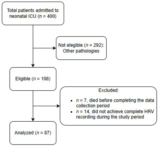 Heart rate variability (HRV), which reflects the complex interplay between the sympathetic and parasympathetic nervous systems, has emerged as a promising, non-invasive, and low-cost biomarker for monitoring neurological function in neonates with hypoxic–ischemic encephalopathy (HIE) [21]. Specifically, HRV analysis during therapeutic hypothermia (TH) has been established as a real-time bedside tool for the early risk stratification of neurological injury [21,22].
