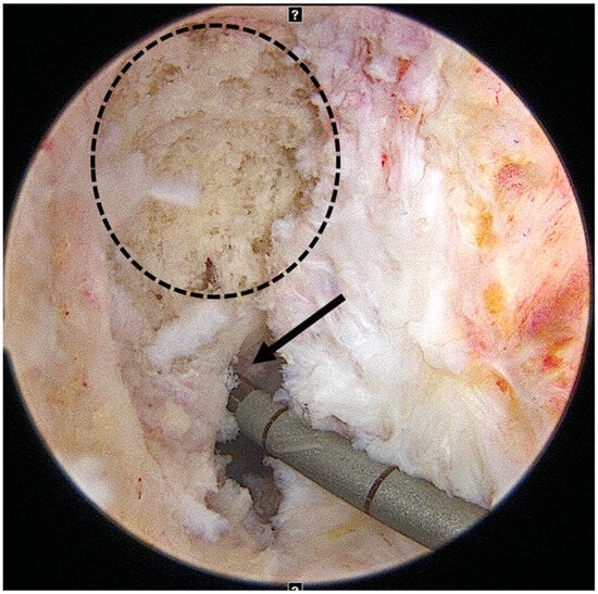 One-stage revision anterior cruciate ligament reconstruction (ACLR). The dotted circle indicates the previous nonanatomic femoral tunnel, which was bone grafted with an allograft. The arrow demonstrates creation of a new anatomic femoral tunnel using a flexible reamer system.