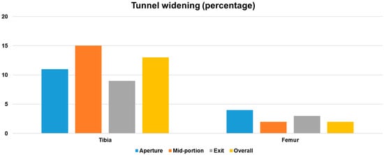 Bar diagram showing tunnel widening at three predefined levels (aperture, mid-portion, exit) in the tibial and femoral tunnels at 2 years postoperatively. Values represent mean changes in tunnel diameter, with each level determined by the largest measurement among axial, sagittal, and coronal CT planes relative to baseline measurements at postoperative day 2.