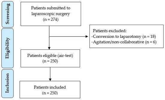 After obtaining approval from the Ethics Committee of the Hospital Universitario de Gran Canaria Doctor Negrín (approval #2019-484-1, on 2 December 2019) and prospectively registering in ClinicalTrials.gov (NCT04895527), we conducted a prospective observational study. Inclusion criteria were patients aged 18 years and older, scheduled for laparoscopic surgery between June 2020 and June 2024. Written informed consent was obtained from each patient. Exclusion criteria were conversion to laparotomy, pregnancy, uncooperative or agitated patients in the immediate postoperative period, history of lung resection, and refusal to participate in the study.