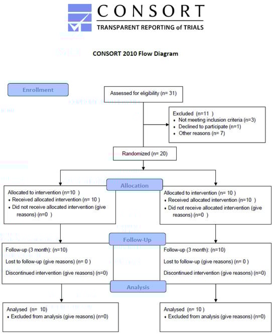 This study was conducted as a pilot randomized controlled trial, with the primary aim of evaluating feasibility and preliminary clinical effects of a physiotherapy program incorporating neurodynamic mobilization techniques. It followed the CONSORT (Consolidated Standards of Reporting Trials) extension for clinical trials [] in accordance with the Declaration of Helsinki []. This study compared, with a 3-month follow-up, the effect of the inclusion of a neurodynamic mobilization intervention compared with a strength program on functional and psychosocial outcomes in patients surgically treated for head and neck cancer with shoulder dysfunction. The study design was approved on 25 February 2022 by Complejo Hospitalario Universitario de Canarias, Spain (CHUNSC_2021_91) and the trial was registered prior to recruitment on 3 November 2022 (ClinicalTrials: NCT05604235). The selection process is outlined in Figure 1.