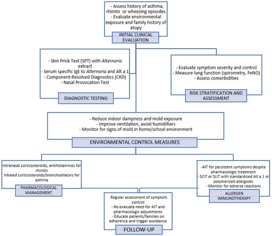Diagnostic and management algorithm for Alternaria alternata allergy. The flowchart outlines steps from initial clinical evaluation and diagnostic testing to environmental control, pharmacological management, and allergen immunotherapy. It emphasizes a personalized approach including symptom monitoring and follow-up.