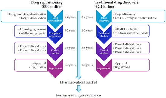 Comparative timelines, costs, and stages of traditional drug discovery versus drug repositioning.