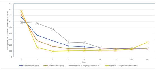 All patients were evaluated for serum creatinine changes up to 14 days postoperatively (see Table 3 and Figure 1). After applying a Bonferroni correction for the four primary time points analyzed (days 5, 10, 14 and 12 months), a significantly lower serum creatinine level was observed in the HMP group only on postoperative day 5 (179.06 µmol/L vs. 274.94 µmol/L, p = 0.044). No significant differences were found between the groups at the other time points.
