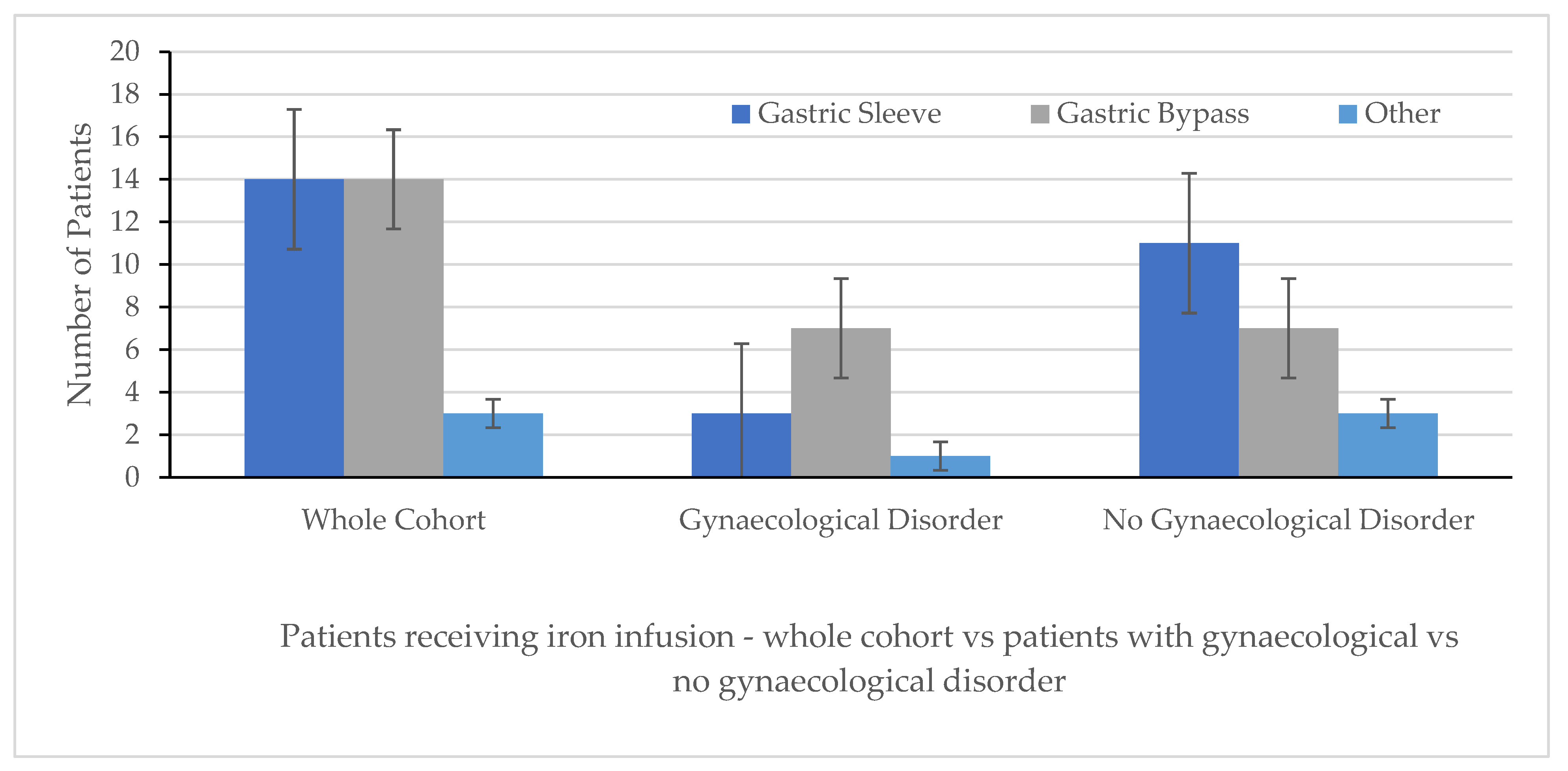 MacVicar, E.; Saleh, N.; Tneoh, J.; Lucocq, J.; Geropoulos, G.; Wallace, B.; Ewing, A.; Lamb, P.J.; Drummond, G.; Joyce, B.; et al. Intravenous Iron Infusion in the Treatment of Iron Deficiency Anaemia Following Bariatric and Metabolic Surgery and Correlation with Gynaecological Disorders: Retrospective Review of Experience from a Tertiary Centre. Medicina 2025, 61, 1647. https://doi.org/10.3390/medicina61091647
