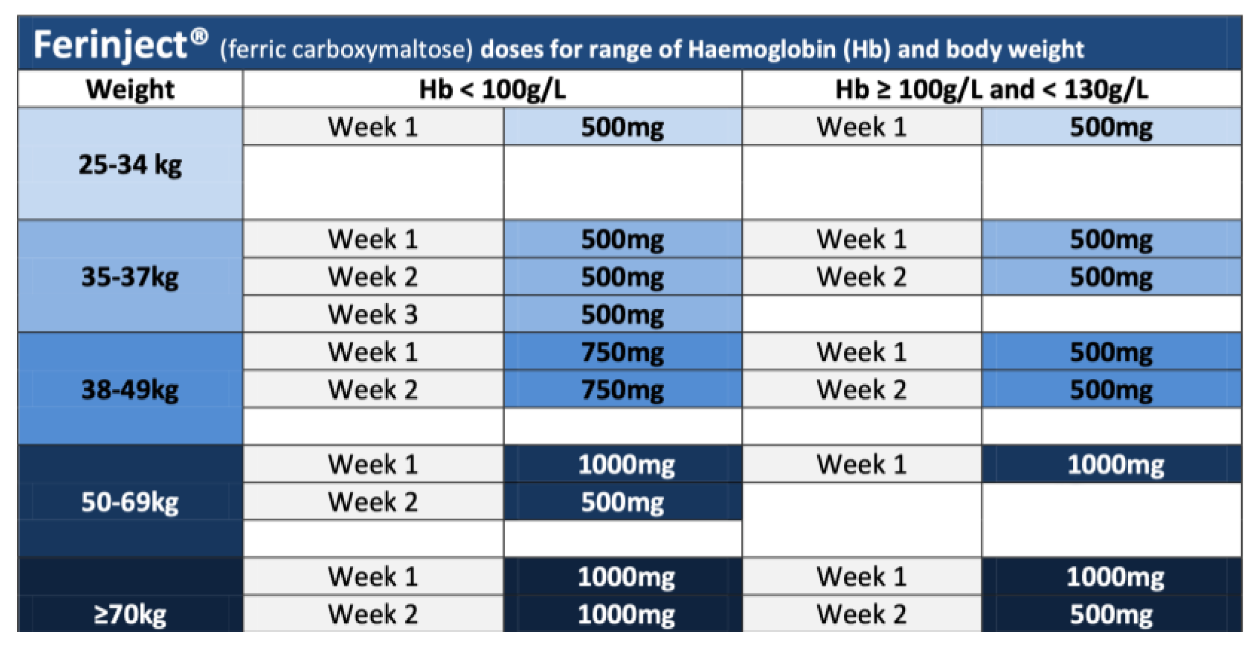 Appendix A. Iron Infusion—Ferinject®—Dosage Calculation and Administration Regime