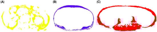 SFA mask (blue): subcutaneous adipose tissue external to the abdominal wall (A). VFA mask (yellow): intra-abdominal/visceral adipose tissue enclosed by the abdominal wall (B). TAMA mask (red): total abdominal skeletal muscle, including psoas, paraspinal, and abdominal wall muscles (C).
