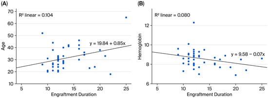 Relationship between engraftment duration and (A) age and (B) hemoglobin levels.