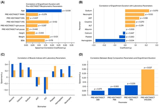Analyses of engraftment duration’s correlations with morphometric, laboratory, and body composition parameters. (A) correlation of engraftment duration with pre-HDCT/ASCT morphometric parametres, (B) correlation engraftman duration an laboratory parameters, (C) correlations between muscle mass indices and laboratory parameters, (D) correlation between body composition parameters and engrafment duration.