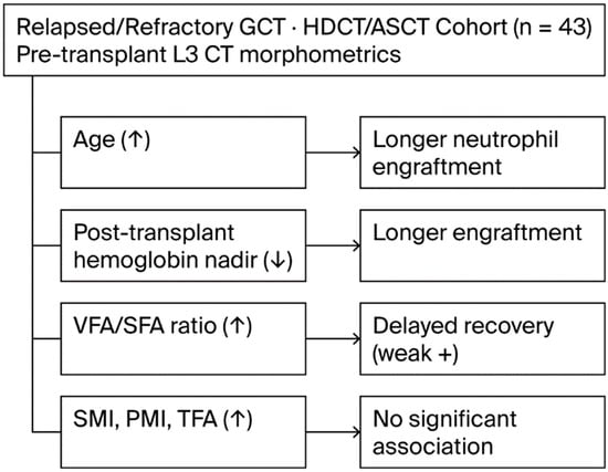 Older age and lower post-transplant hemoglobin are independently associated with longer engraftment after HDCT/ASCT. Among the morphometrics, the VFA/SFA (visceral adiposity predominance) shows a weak positive association with delayed engraftment; the SMI, PMI, and TFA are not predictive. The results support pre-transplant risk stratification using simple clinical and imaging metrics (Figure 4).