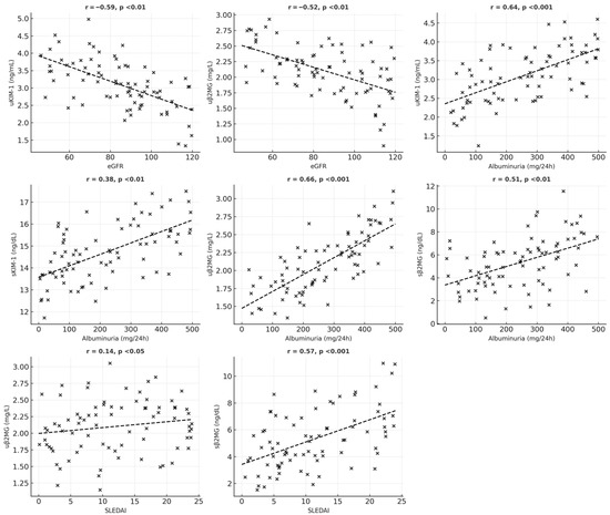 For β2MG, both serum and urinary levels were associated with increased albuminuria and markers of inflammation; however, only urinary β2MG correlated with lower eGFR and active urinary sediment. Serum β2MG levels show a significant positive correlation with SLEDAI scores and the presence of mucocutaneous manifestations (such as ulcers, lesions of the oral mucosa, and alopecia) and vary moderately with hematological abnormalities (including anemia, leukopenia, and thrombocytopenia). A statistically significant positive correlation was also identified between serum and urinary β2MG levels (Figure 1 and Figure 2).