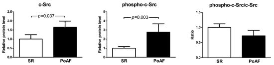 Expression of c-Src and phospho-c-Src was significantly higher in the PoAF group than in controls. c-Src relative expression in PoAF patients was 1.65 ± 1.28 as compared to 1.0 ± 1.28 in the SR group (p = 0.037). The level of phosphorylated c-Src was also higher in the PoAF group (2.75 ± 3.5 vs. 1 ± 0.87 in the SR group, p = 0.003). The relative abundance of c-Src, phospho-c-Src, and their ratio is presented in Figure 1.