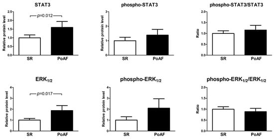 Relative expression of STAT3 protein and ERK1/2 kinases was higher in the PoAF group (upper and lower left graphs, respectively), while their phosphorylation was comparable between groups (right graphs). Protein levels were normalized to β-actin and then scaled relative to the mean value of the SR group, which was set to 1. Statistical comparisons were performed using the Mann–Whitney U test. Bars represent mean values ± SEM.