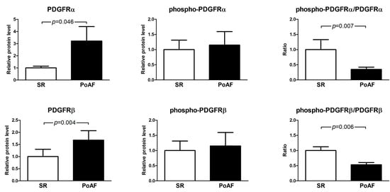 Expression of important upstream Src regulators, such as PDGF (platelet-derived growth factor) receptor subtypes α and β, was also higher in PoAF patients (PDGFRα: 3.2 ± 4.42 vs. 1.0 ± 0.76; p = 0.047; PDGFRβ: 1.68 ± 1.46 vs. 1.0 ± 0.63; p = 0.004). The amounts of phosphorylated PDGF receptors in the PoAF group were not significantly different than those in the SR group. In the PoAF group, we observed a significantly lower ratio between phosphorylated and total abundances of these receptors (phospho-PDGFRα/PDGFRα ratio in PoAF group was 0.35 ± 0.27 vs. 1.0 ± 1.7 in SR group, p = 0.007; phospho-PDGFRβ/PDGFRβ: 0.53 ± 0.28 vs. 1.0 ± 0.65 in the PoAF and SR groups, respectively, p = 0.006; Figure 3). Low percentage of phosphorylated PDGFRs suggests compensatory silencing of the PDGF pathway; however, elevated expression of the receptors may constitute a foundation for fast induction and overactivation of this pathway during or after the operation.
