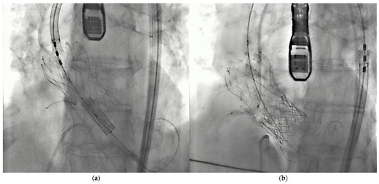 Snorkel stenting during TAVI in one of the study patients. In this particular case, a valve-in-valve procedure was performed, involving the implantation of a balloon-expandable valve within a previously placed self-expanding valve. (a) The right coronary artery is pre-wired prior to THV deployment to allow for stenting. (b) The coronary stent is then positioned and deployed following THV implantation.