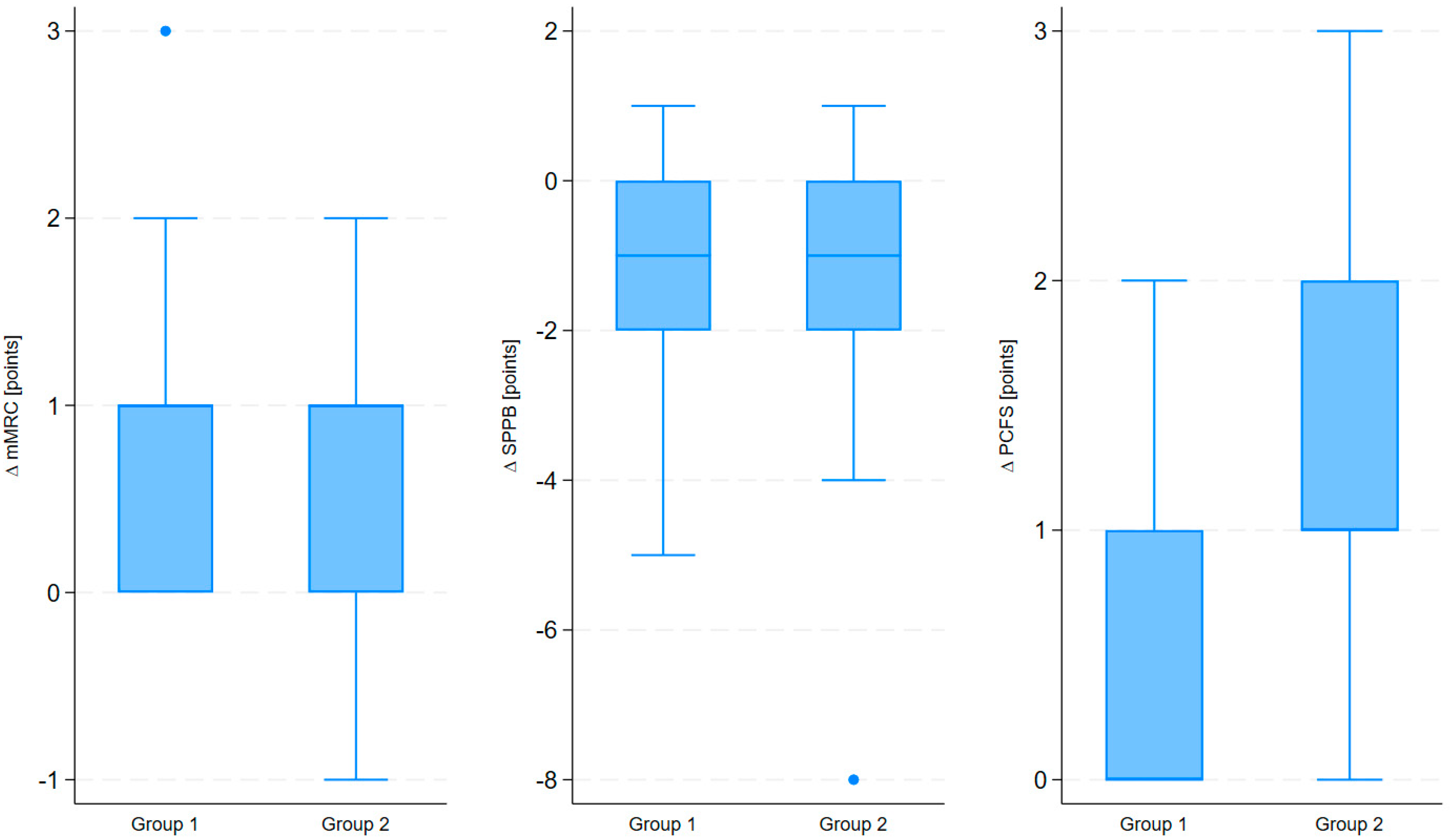 ∆ SPPB | −2.28 | −0.036 | 0.021 | −1.74 | 2.85 | −0.077; 0.005 | 0.135 | 0.088 | 0.085 | |