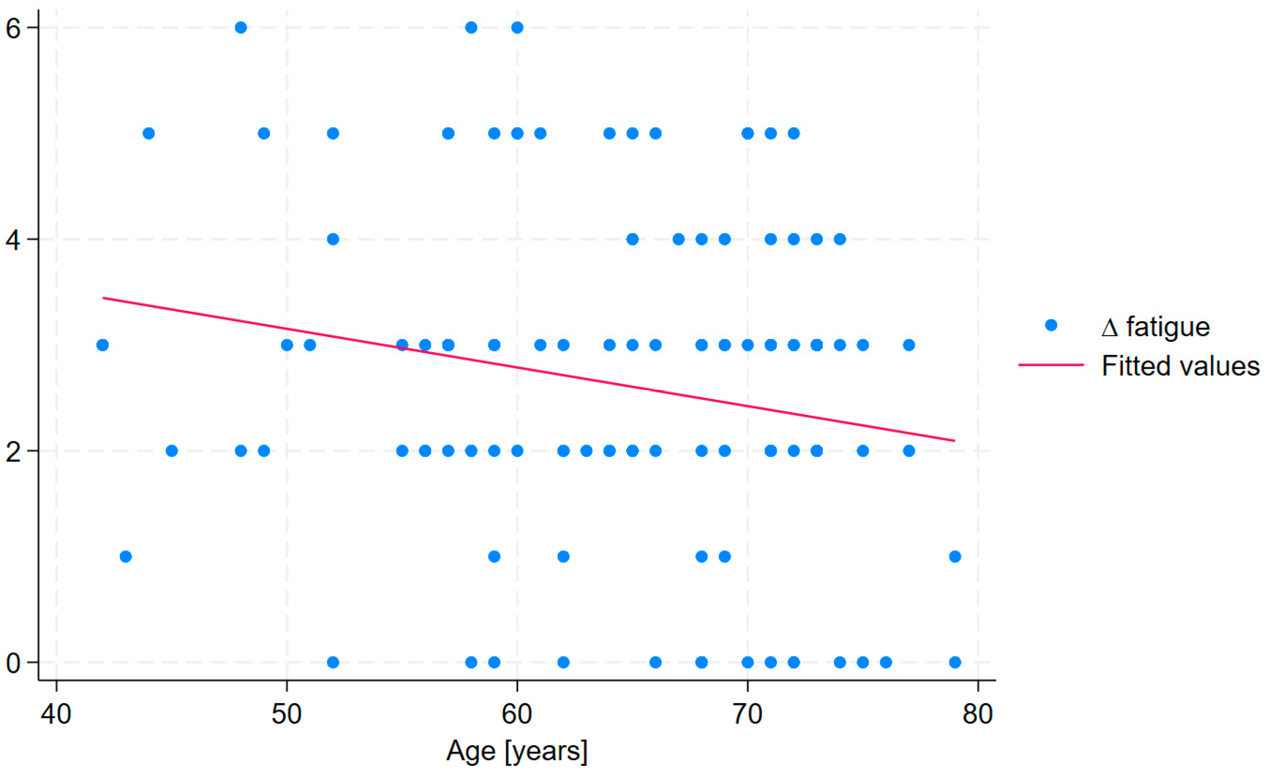 Treatment duration | ∆ fatigue * | 6.49 | 0.057 | 0.023 | 2.49 | 2.61 | 0.012; 0.102 | 0.125 | 0.077 | 0.014 |