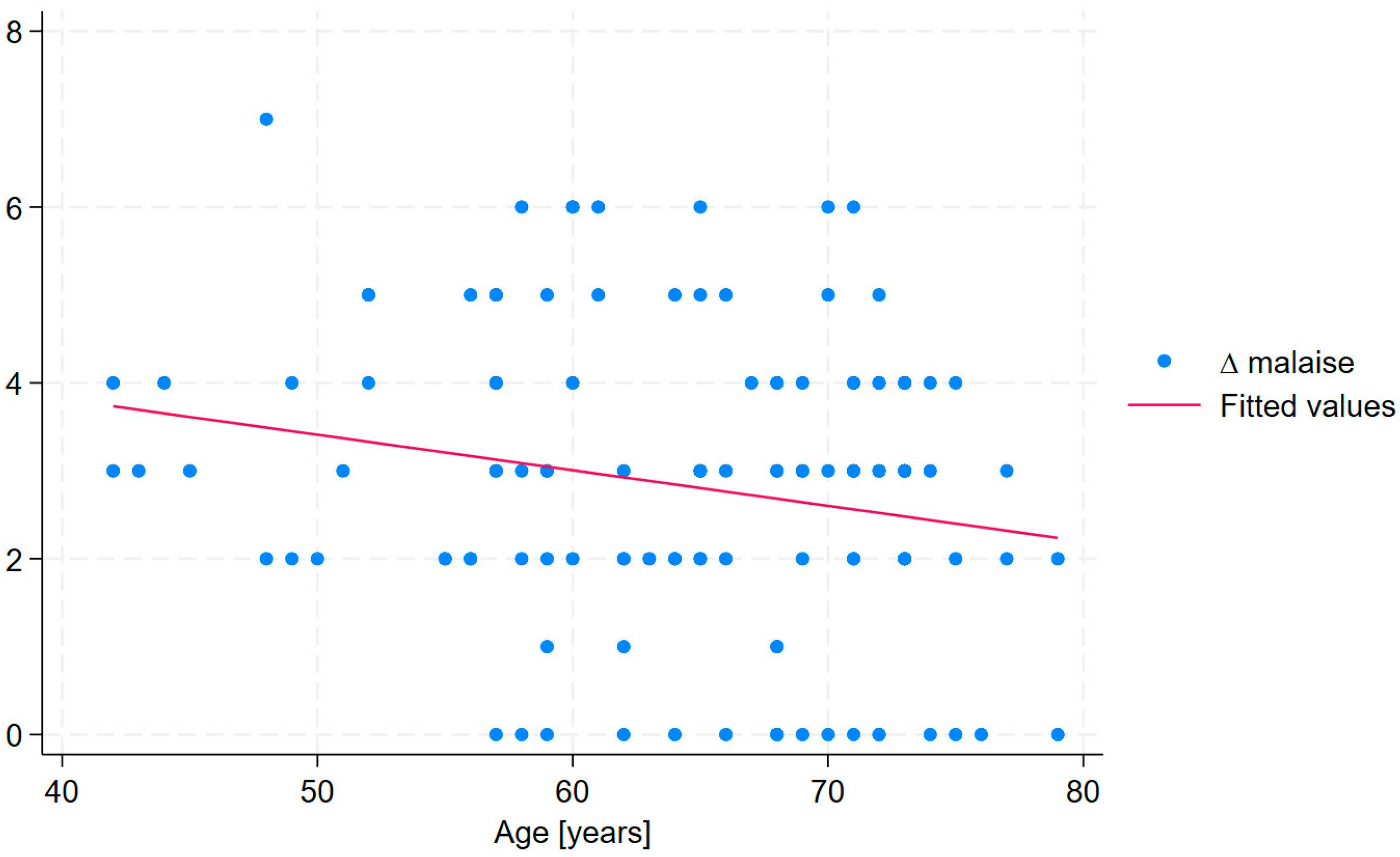 ∆ malaise * | 7.31 | 0.063 | 0.024 | 2.59 | 3.33 | 0.015; 0.112 | 0.154 | 0.108 | 0.011 | |