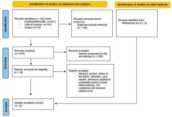 After carrying out our comprehensive literature review, we identified 812 potentially relevant studies (PubMed/MEDLINE: 611 records; Web of Science: 167 records; Scopus: 34 records) Figure 1. Following a review of the publications to screen for duplicates, we excluded 142 articles. Furthermore, 595 papers were excluded after an in-depth evaluation of their titles and abstracts. Accordingly, 16 texts were identified for a rigorous review. As 8 articles did not satisfy the eligibility criteria, only 8 comparative articles were considered for qualitative and quantitative synthesis, as they fulfilled the necessary criteria [18,19,20,21,22,23,24,25]. Once the other sources (reference list) were analyzed, no further records were retrieved.