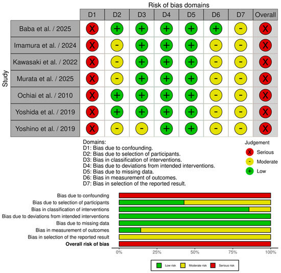 According to ROBINS-I V2, seven non-randomized studies revealed “serious” overall bias [18,19,21,22,23,24,25] (Figure 2).