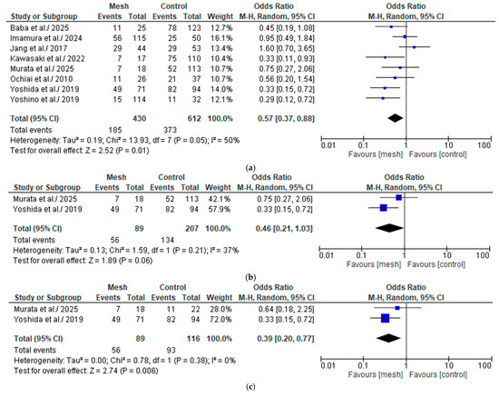 The CR-POPF was assessed by two of the eight studies considered in our meta-analysis, comprising 205 patients: 89 in the WMG and 116 in the CG (only with hand-sewn closure technique) [22,24] Figure 5c. Following an examination of the pooled results on the CR-POPF, based on the meta-analysis, a statistically significant difference was identified within the groups under review [Odds Ratio (OR): 0.26, 95% confidence interval (CI): 0.09, 0.71; p = 0.009]. The reported I2 value was 0% (low heterogeneity), with a p-value of 0.63, a result that was not statistically significant.