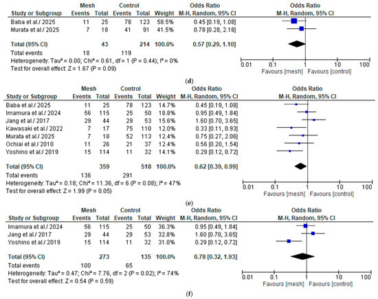The overall-POPF was assessed by three of the eight studies considered in our meta-analysis, comprising 408 patients: 273 in the WMG (only with PGA mesh and without reinforced suture closure) and 135 in the CG [19,20,25], as shown in Figure 4f. Following an examination of the pooled results on the overall-POPF, based on the meta-analysis, no statistically significant difference was identified within the groups under review [Odds Ratio (OR): 0.78, 95% confidence interval (CI): 0.32, 1.93; p = 0.59]. The reported I2 value was 74% (high heterogeneity), with a p-value of 0.59, a result that was not statistically significant.
