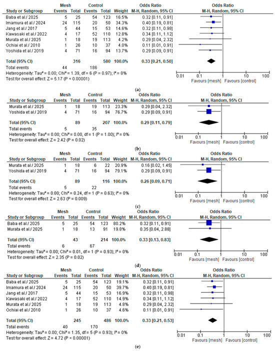 The CR-POPF was assessed by six of the eight studies considered in our meta-analysis, comprising 731 patients: 245 in the WMG (only with PGA mesh) and 486 in the CG [18,19,20,21,22,23], as shown in Figure 5e. Following an examination of the pooled results on the CR-POPF, based on the meta-analysis, a statistically significant difference was identified within the groups under review [Odds Ratio (OR): 0.33, 95% confidence interval (CI): 0.21, 0.53; p < 0.00001]. The reported I2 value was 0% (low heterogeneity), with a p-value of 0.93, a result that was not statistically significant.