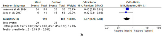 The CR-POPF was assessed by two of the eight studies considered in our meta-analysis, comprising 262 patients: 159 in the WMG (only with PGA mesh and without reinforced suture closure) and 103 in the CG [19,20], as shown in Figure 5f. Following an examination of the pooled results on the CR-POPF, based on the meta-analysis, a statistically significant difference was identified within the groups under review [Odds Ratio (OR): 0.37, 95% confidence interval (CI): 0.20, 0.68; p = 0.001]. The reported I2 value was 0% (low heterogeneity), with a p-value of 0.77, a result that was not statistically significant.