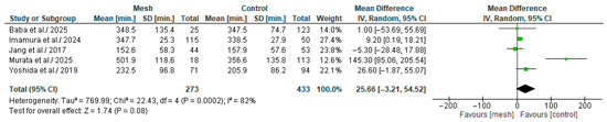 Overall Operative time (overall-OP) was assessed by five of the eight studies considered in our meta-analysis, comprising 706 patients: 273 in the WMG and 433 in the CG [18,19,20,22,24], as shown in Figure 6. Following an examination of the pooled results on the overall-OP, based on the meta-analysis, no statistically significant difference was identified within the groups under review [MD: 25.66, 95%, CI: −3.21, 54.52, p = 0.08]. The recorded I2 value was 82% (high heterogeneity), with a p-value of 0.0002, a result that was statistically significant.