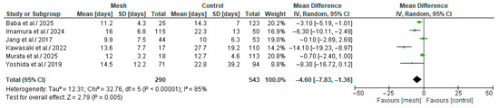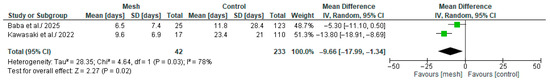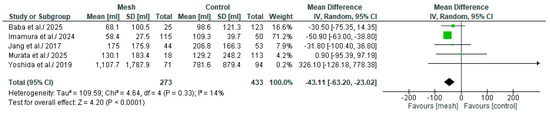 Estimated Blood Loss (EBL) was assessed by five of the eight studies considered in our meta-analysis, comprising 706 patients: 273 in the WMG and 433 in the CG [18,19,20,22,24], as shown in Figure 7. Following an examination of the pooled results on the EBL, based on the meta-analysis, a statistically significant difference was identified within the groups under review [MD: −43.11, 95%, CI: −63.20, −23.02, p < 0.0001]. The reported I2 value was 14% (low heterogeneity), with a p-value of <0.0001, a result that was statistically significant. Using the leave-one-out method, we found that excluding Baba et al., Murata et al. or Yoshida et al. study from the analysis still yielded a statistically significant result. However, excluding Imamura et al. or Jang et al. study, the result persisted in favor of the wrapping mesh group, nonetheless without reaching statistical significance (see Supplementary Materials, Figure S1).