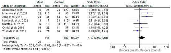 Table 1 provides details of the included studies and cohorts. Among the eight studies included in the systematic review, seven were retrospective observational studies [18,19,21,22,23,24,25] and one was a randomized controlled trial [20]. They came from Japan [18,19,21,22,23,24,25] and South Korea [20]. The recorded observation period lasted approximately 21 years (2003–2024), Table 1. The overall cohort totaled 1042 patients, with study group sizes ranging from 17 to 123. Five studies reported data on the sex of patients: 48.9% of patients were male (345/706) [18,19,20,22,24]. Data from 5 studies showed that the mean age of the cohorts in each study assessed was between 54.5 and 68.5 years [18,19,20,22,24]. Data from 4 studies showed that mean BMI of the cohorts in each study evaluated fell between 21.3 and 23.1 kg/m2 [18,19,22,24], Table 1. The Wrapping Mesh Group (WMG) population comprised 430 patients (41.3%) with study cohort sizes spanning 17 to 115 [18,19,20,21,22,23,24,25]. 52.4% patients were male (143/273) [18,19,20,22,24]. The mean age of the subjects in each study reviewed fell within the range of 59.9 to 68.5 years old [18,19,20,22,24]. The mean BMI of the subjects in each study examined spanned from 21.3 to 23.1 kg/m2 [18,19,22,24]. PGA mesh was used in 7 studies [18,19,20,21,22,23,25], except for Yoshida et al., who used a polyglactin mesh (Vicryl mesh; Ethicon, Inc., Somerville, NJ, USA) [24], Table 1. Table 1 also lists the specific surgical methods used, in addition to the application of the mesh, by the various experimental groups, for the handling of the pancreatic remnant with the purpose of reducing POPF. Specifically: six studies reported the use of a sealant in combination with mesh [18,19,20,21,23,25], while two reported the use of a transpancreatic mattress suture [22,24]. Three studies have reported the use of a reinforced suture for pancreatic transection [18,21,23], Table 1. The population of control groups (CG) consisted of 612 patients (58.7%) with study sample sizes ranging from 32 to 123 [18,19,20,21,22,23,24,25]. 46.7% patients were male (202/433) [18,19,20,22,24]. The mean age of the cohorts in each study assessed ranged from 54.5 to 67.6 [18,19,20,22,24]. The mean BMI of the subjects in each study assessed spanned 21.7 to 22.4 kg/m2 [18,19,22,24]. Supplementary Materials, Table S1 lists: the type of surgical approach used for D/LP (open, laparoscopic or robotic), whether or not the D/LP was with preservation of the spleen, whether intra-abdominal surgical drainage was placed, the histology of the lesion.