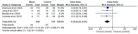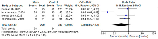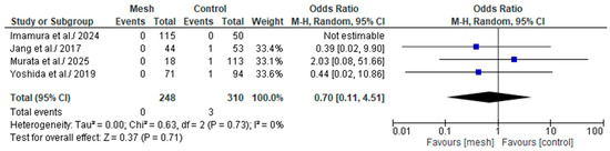 Figure 14. Forest plot comparing readmission between the Wrapping mesh group vs. Control group [18,19,22,24].