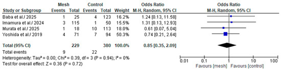 Baba et al., 2025 [18]PGA mesh + Reinforced stapler suture closure + fibrin glue25116N/AN/A5