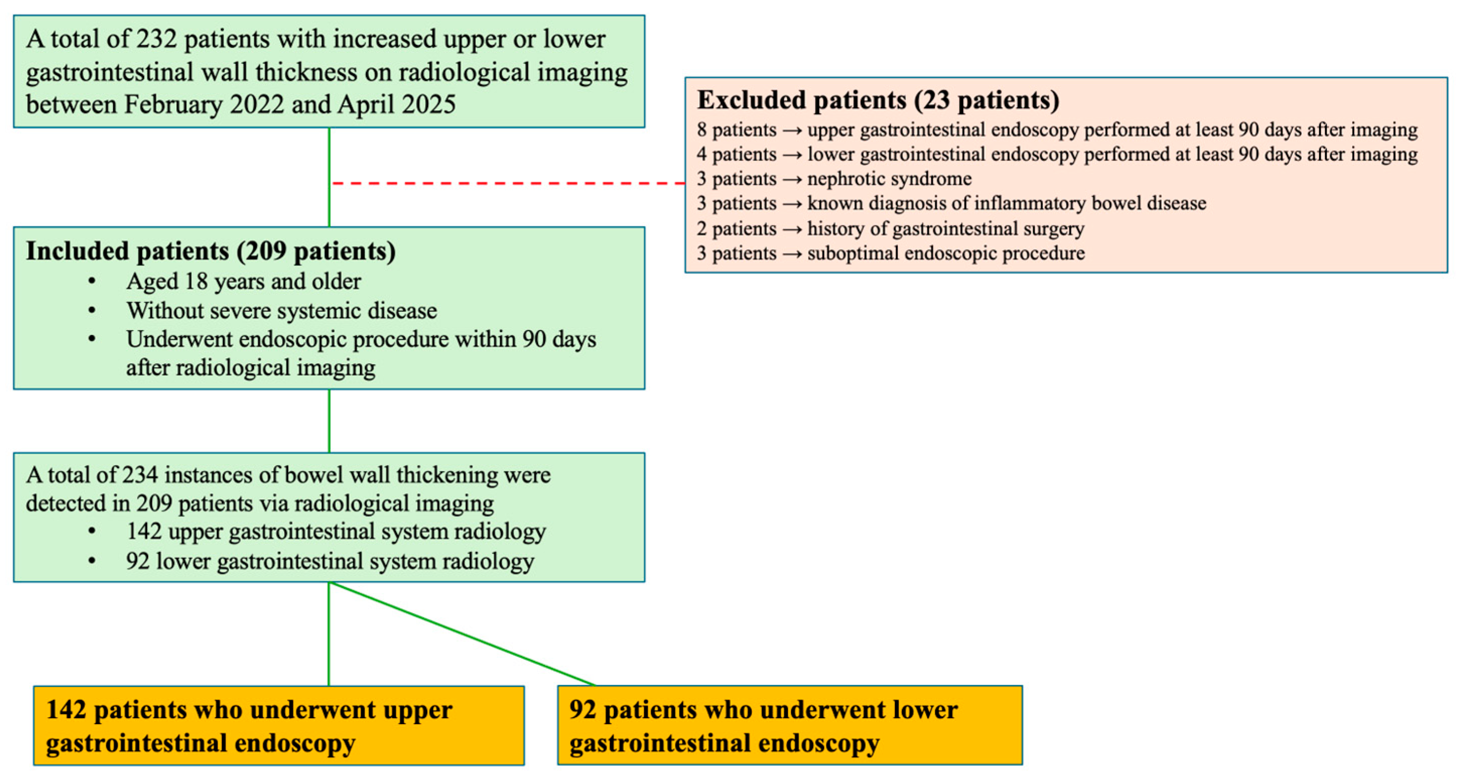 Chicago/Turabian StyleErgin, Mustafa, and Fatih Kıvrakoğlu. 2025. "Evaluation of Endoscopic Findings in Gastrointestinal Tract Wall Thickening Detected on Abdominal Radiological Imaging: A Two-Center Retrospective Descriptive Study" Medicina 61, no. 9: 1699. https://doi.org/10.3390/medicina61091699