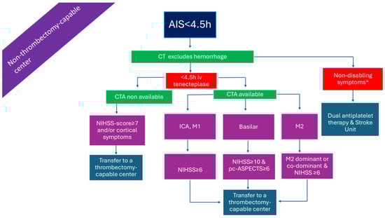 Alternatively, treating physicians may base the decision to transfer the patient with LVO-AIS on a total NIHSS score cut-off of ≥5. Recent research has shown that, in such cases, the best medical treatment is equivalent to EVT in the presence of LVO; therefore, transfer may be withheld []. Finally, in patients with minor AIS and non-disabling symptoms, the superiority of dual antiplatelet therapy over IVT has been shown in a recent network meta-analysis [].