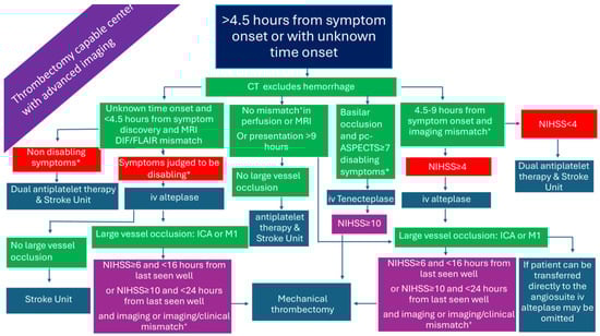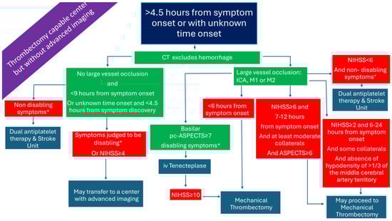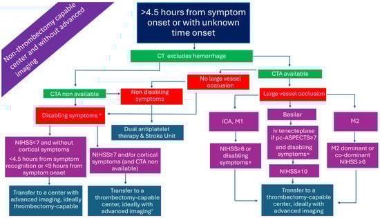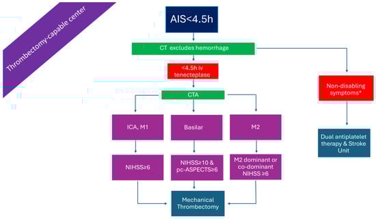 In patients presenting within the 4.5 h time window with disabling symptoms, IVT can be administered based solely on plain brain computed tomography (CT) []. In the case where no CT angiography (CTA) is available, treating physicians may use established stroke scales for LVO-AIS prediction, or, simply, the total National Institutes of Health Stroke Scale (NIHSS) score with a threshold of 7, which has been shown to have a sensitivity of 81.0%, specificity of 76.6%, positive predicting value of 84.2%, negative predictive value of 72.4%, and accuracy of 79.3% for predicting LVO-AIS. Incorporating the presence of ‘cortical’ symptoms—such as aphasia, neglect, hemianopia, and gaze deviation—as well as upper arm weakness, may improve diagnostic accuracy []. Immediate transfer of these patients, as well as those with a clinical suspicion of basilar artery occlusion, to a thrombectomy-capable center is warranted. The transition from alteplase to tenecteplase as the thrombolytic of choice—given as a bolus injection instead of a 1 h infusion, due to its longer half-life—facilitates the workflow of patients, diminishes time delays, and minimizes dosing errors. These advantages, derived from the adoption of tenecteplase as the thrombolytic of choice, may prove particularly valuable in resource-limited settings, potentially reducing the cost of AIS management. Moreover, tenecteplase, compared to alteplase, has an increased resistance to the plasminogen activator inhibitor 1 and a higher fibrin specificity resulting in an improved safety profile and reduced systemic bleeding [,,].