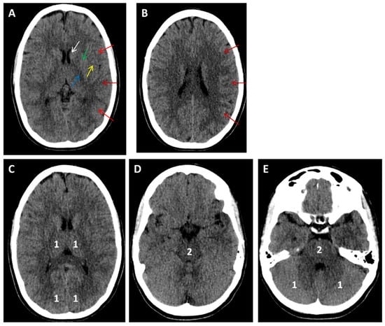 Alberta stroke program early CT score (ASPECTS; shown in panels (A,B)) and posterior circulation ASPECTS (pc-ASPECTS; shown in panels (C–E). (A): Regions assessed for early ischemic changes in ASPECTS at the ganglionic level shown with arrows (white: caudate; green: lentiform nucleus; yellow: insula; blue: internal capsule; red arrows: M1, M2, and M3 MCA cortex). Regions assessed for early ischemic changes in ASPECTS at the supraganglionic level shown with red arrows (M4, M5, and M6 MCA cortex). One point is subtracted for each region. (C–E): Regions assessed for early ischemic changes in the pc-ASPECTS. Numbers indicate the points subtracted for each region.