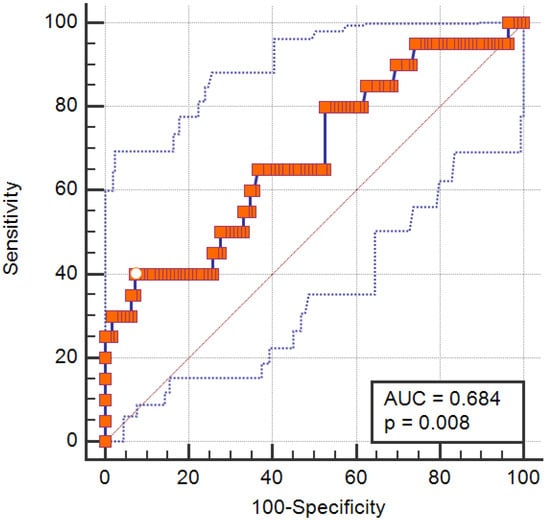 The diagnostic performance of the disulfide/native thiol ratio in predicting SO was evaluated using an ROC curve. The AUC was 0.684 (95% CI: 0.597–0.762; p = 0.008), indicating moderate discriminatory ability (Figure 1). The optimal cut-off value identified by the Youden index was >6.63, which yielded a sensitivity of 40.0% and a specificity of 92.86%.