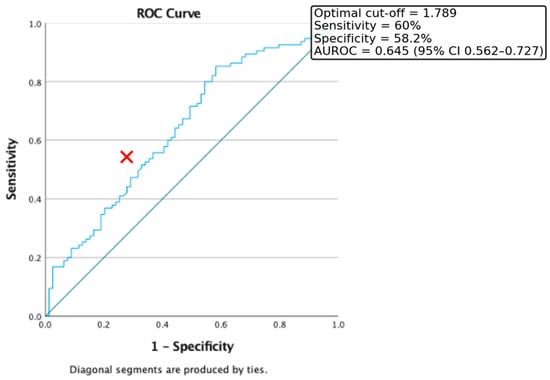 Receiver Operating Characteristic (ROC) curve analysis was conducted to evaluate the discriminative capacity of the triglyceride-to-HDL cholesterol (Tg/HDL) ratio for identifying insulin resistance, defined as HOMA-IR > 2. In our study population, the optimal cut-off value for the Tg/HDL ratio was 1.789, providing a sensitivity of 60% and a specificity of 58.2%. The area under the ROC curve (AUROC) was 0.645 (95% CI: 0.562–0.727) (