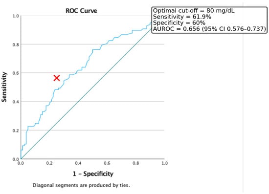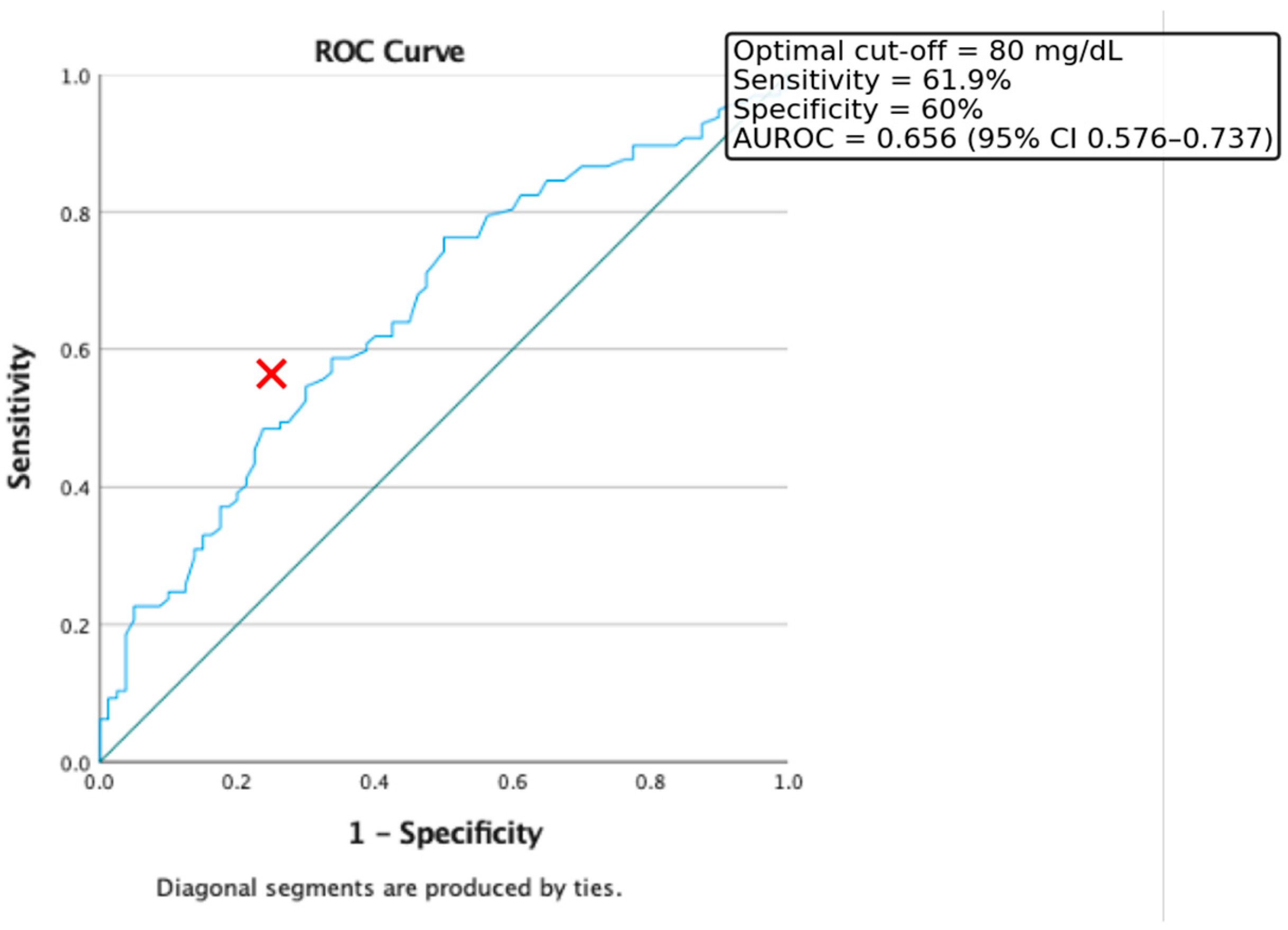 Additionally, ROC curve analysis was conducted to evaluate the predictive value of triglyceride levels alone in identifying insulin resistance. In our cohort, the optimal cut-off point was 80 mg/dL, yielding a sensitivity of 61.9% and a specificity of 60%. The area under the ROC curve (AUC) was 0.656 (95% CI: 0.576–0.737) (